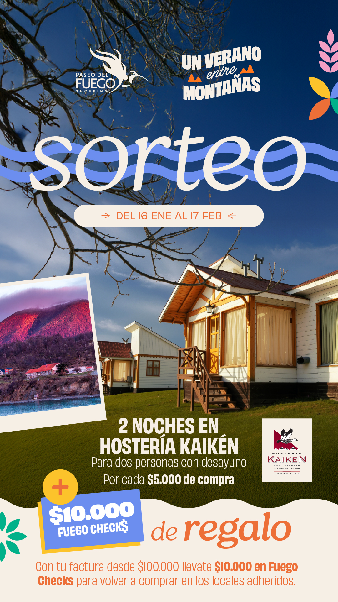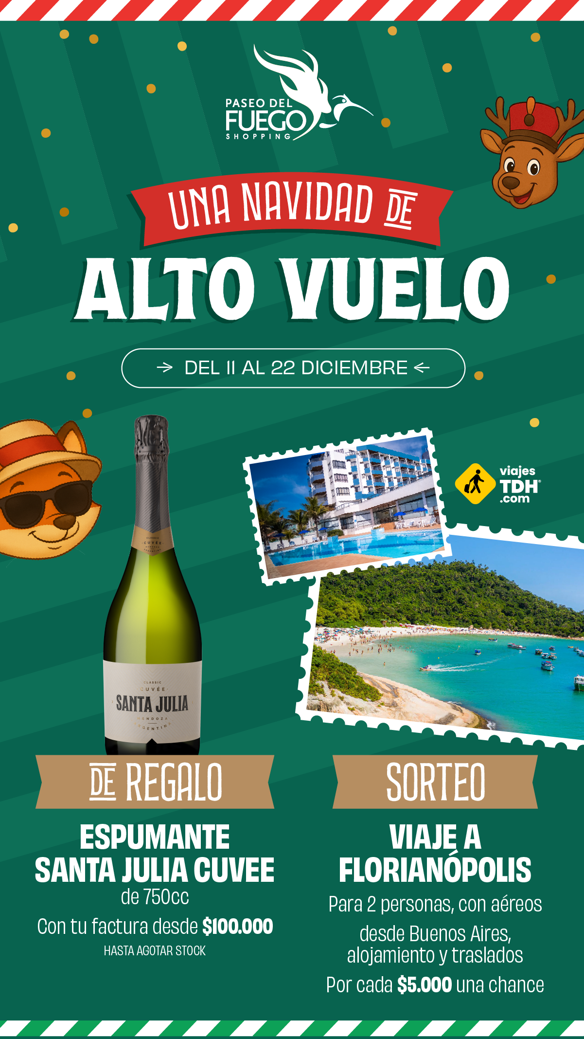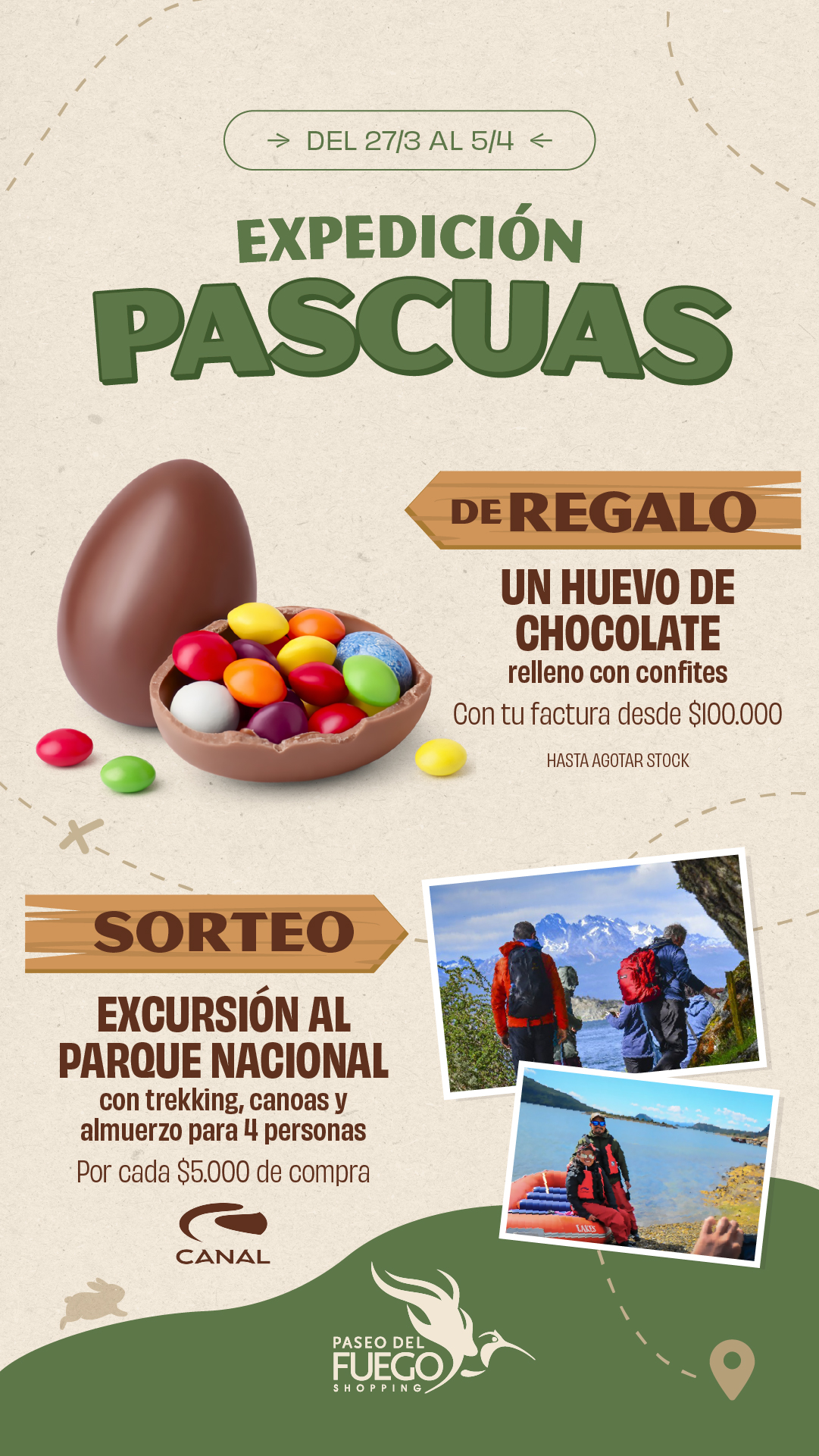PROMOCIÓN POR TIEMPO LIMITADO DEL 11 DE NOVIEMBRE AL 5 DE DICIEMBRE DE 2020, VÁLIDA SÓLO PARA COMPRAS REALIZADAS EN PASEO DEL FUEGO SHOPPING CENTER (AV. PERITO MORENO 1460, USHUAIA). POR CADA $500 DE COMPRA SE ACCEDERÁ A UNA CHANCE PARA EL SORTEO DE: UNA ESTADIA DE DOS (2) NOCHE EN BASE DOBLE CON DESAYUNO INCLUÍDO EN DOMOS DE LA ESTANCIA (KM5 RUTA COMPLEMENTARIA A, RÍO GRANDE, TDF); USO DE JEEP RENEGADE PARA TRASLADO IDA Y VUELTA AL ALOJAMIENTO DURANTE TRES DÍAS. FECHA DE SORTEO: MIÉRCOLES 9 DE DICIEMBRE DE 2020. EN HORARIO A CONFIRMAR. CONSULTE BASES Y CONDICIONES EN EL SHOPPING Y EN PASEODELFUEGO.COM.AR.