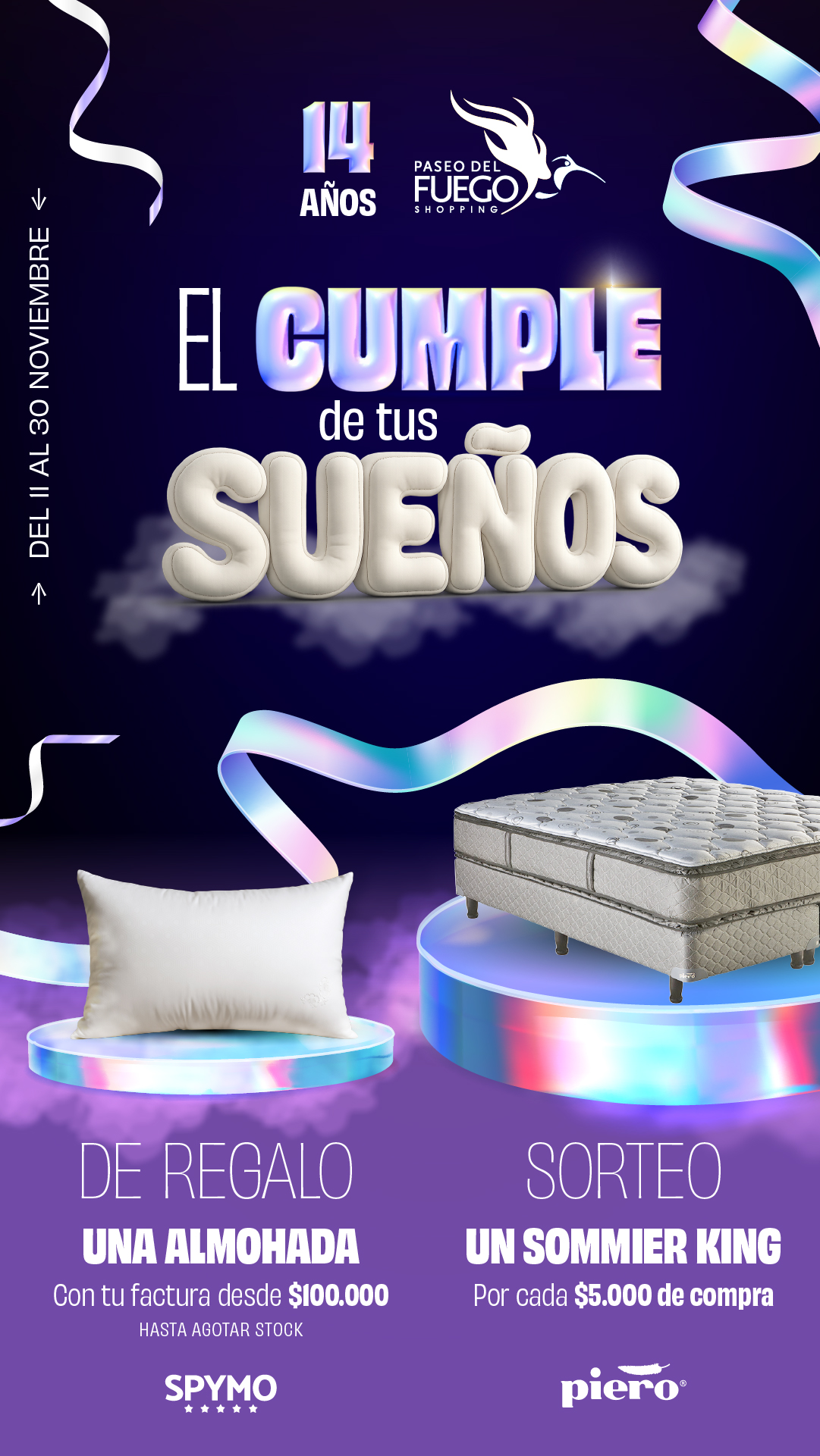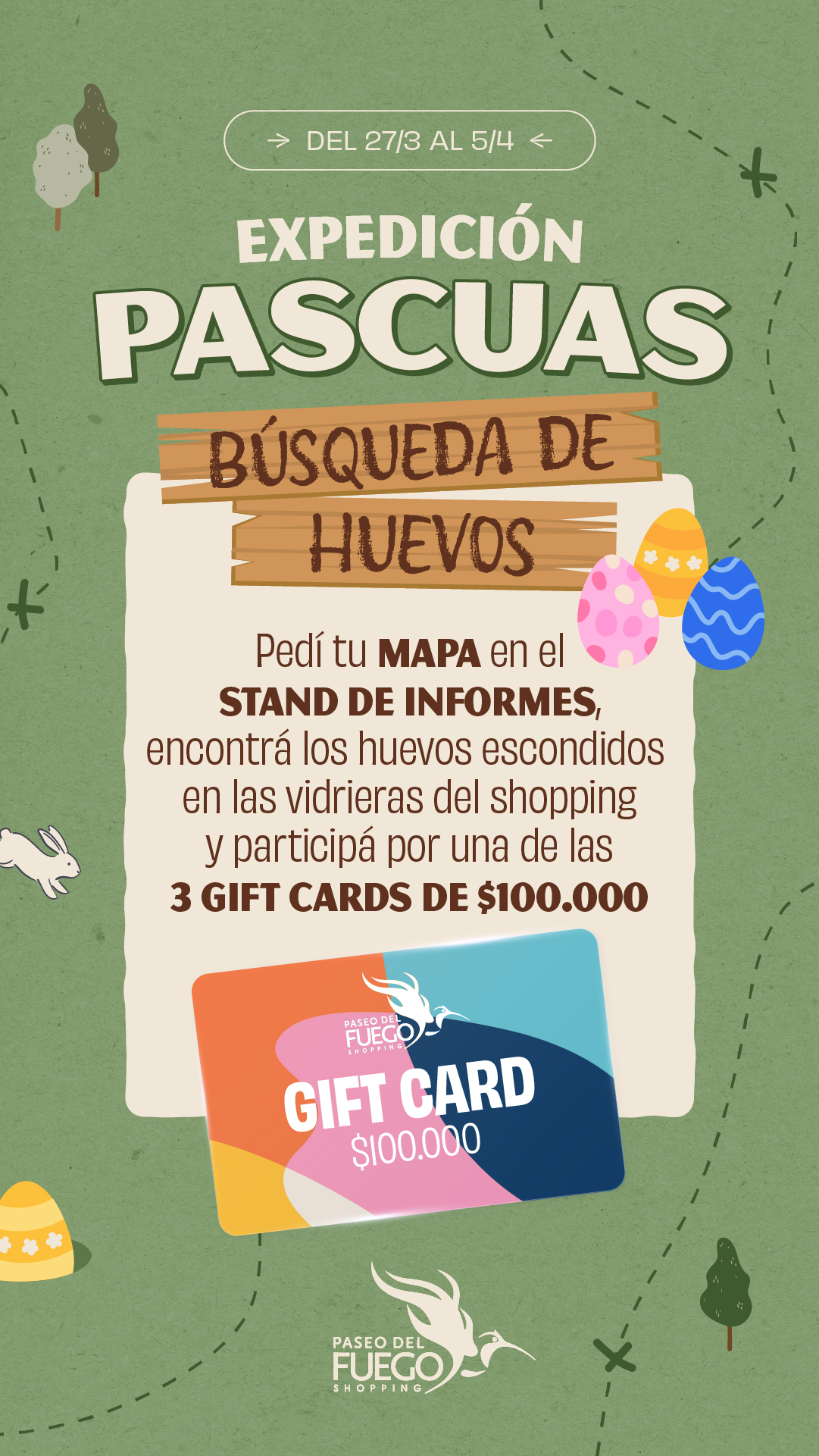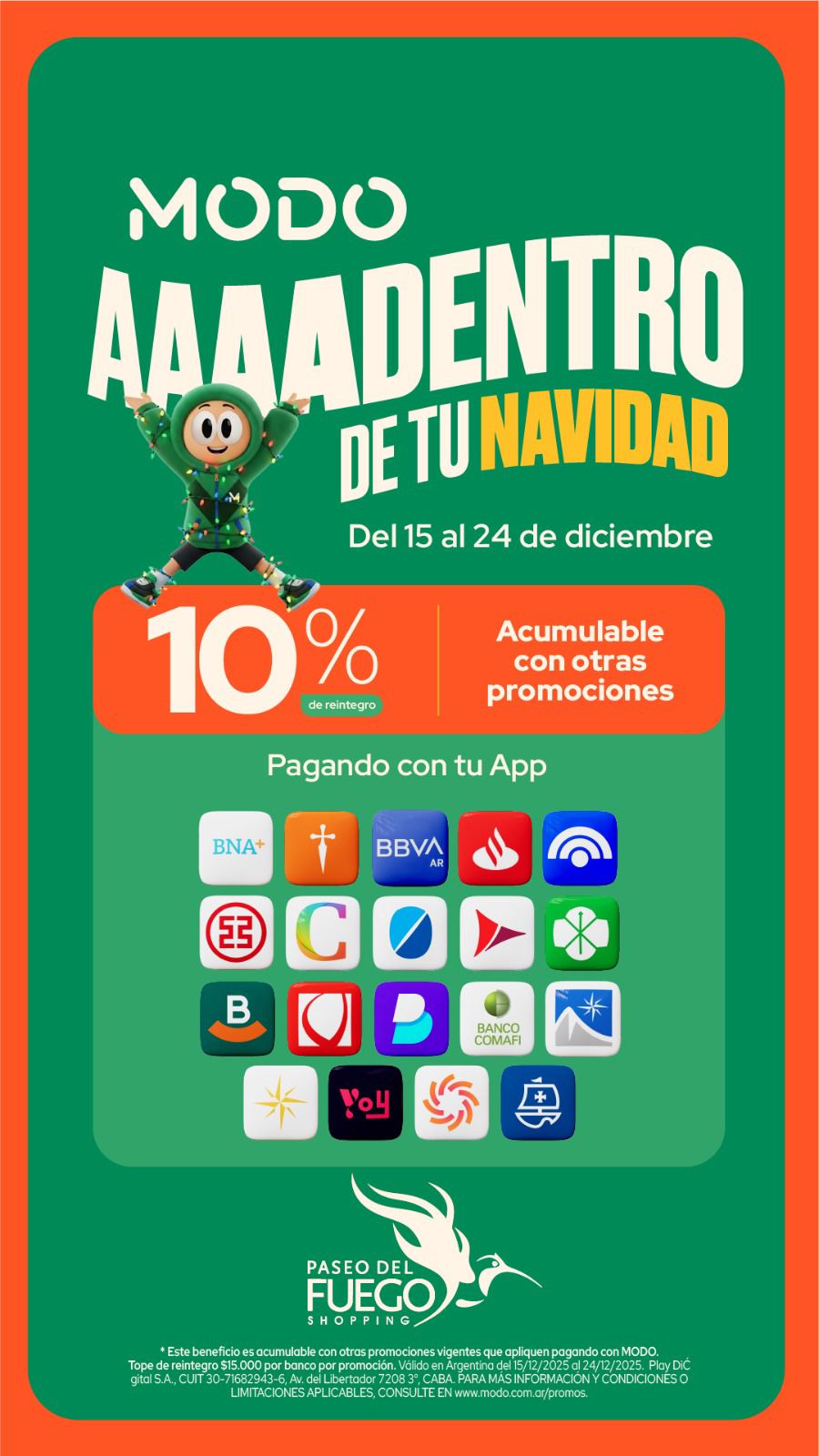 PROMOCIÓN POR TIEMPO LIMITADO DEL 11 DE NOVIEMBRE AL 5 DE DICIEMBRE DE 2020, VÁLIDA SÓLO PARA COMPRAS REALIZADAS EN PASEO DEL FUEGO SHOPPING CENTER (AV. PERITO MORENO 1460, USHUAIA). POR CADA $500 DE COMPRA SE ACCEDERÁ A UNA CHANCE PARA EL SORTEO DE: UNA ESTADIA DE DOS (2) NOCHE EN BASE DOBLE CON DESAYUNO INCLUÍDO EN DOMOS DE LA ESTANCIA (KM5 RUTA COMPLEMENTARIA A, RÍO GRANDE, TDF); USO DE JEEP RENEGADE PARA TRASLADO IDA Y VUELTA AL ALOJAMIENTO DURANTE TRES DÍAS. FECHA DE SORTEO: MIÉRCOLES 9 DE DICIEMBRE DE 2020. EN HORARIO A CONFIRMAR. CONSULTE BASES Y CONDICIONES EN EL SHOPPING Y EN PASEODELFUEGO.COM.AR.